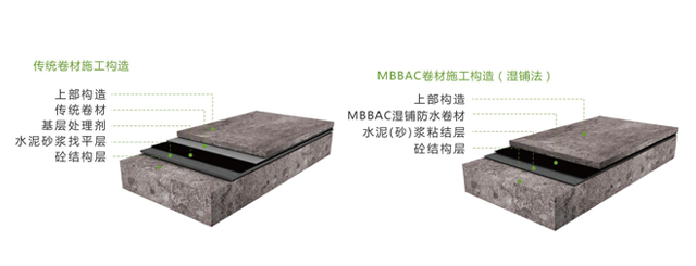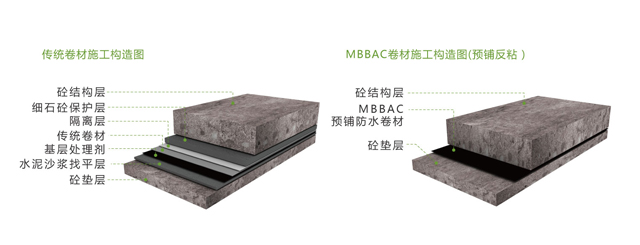 ● 粘結可靠,便于檢修。MBBAC卷材與結構牢固、持久粘結。卷材出現(xiàn)任何局部破壞,水都會被限定在局部很小范圍內,不竄水,不滲漏,退一步來說,即使防水層薄弱點和結構裂縫高度吻合而出現(xiàn)滲漏,也極易檢修。