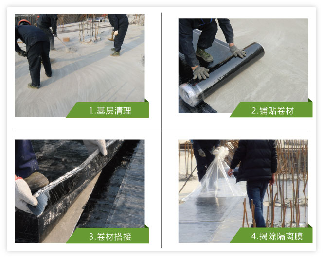 揭除卷材搭接邊隔離膜后搭接碾壓,必要時可適當加熱后搭接。